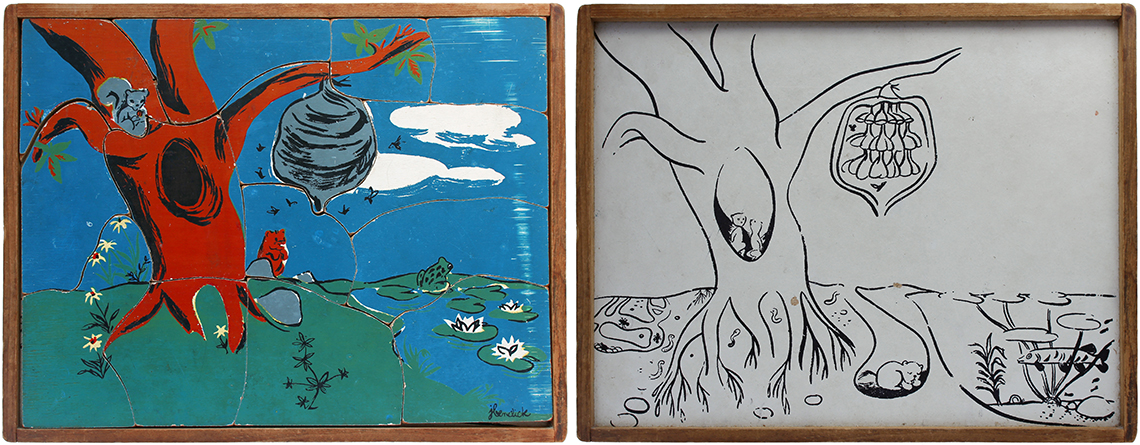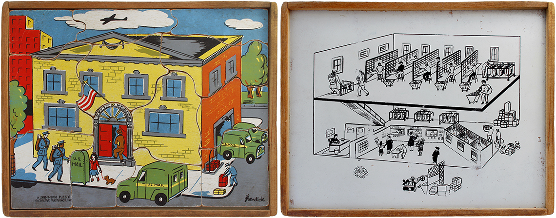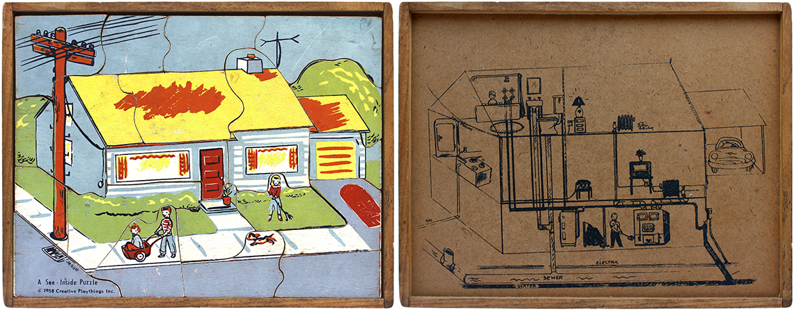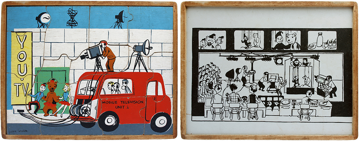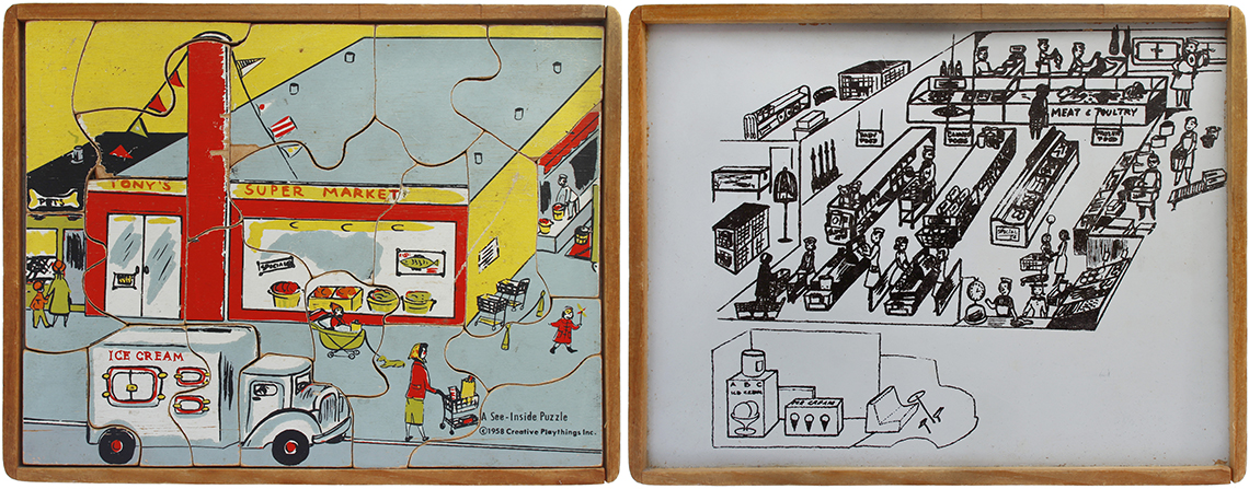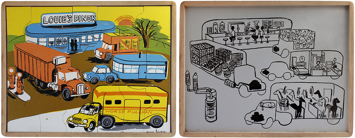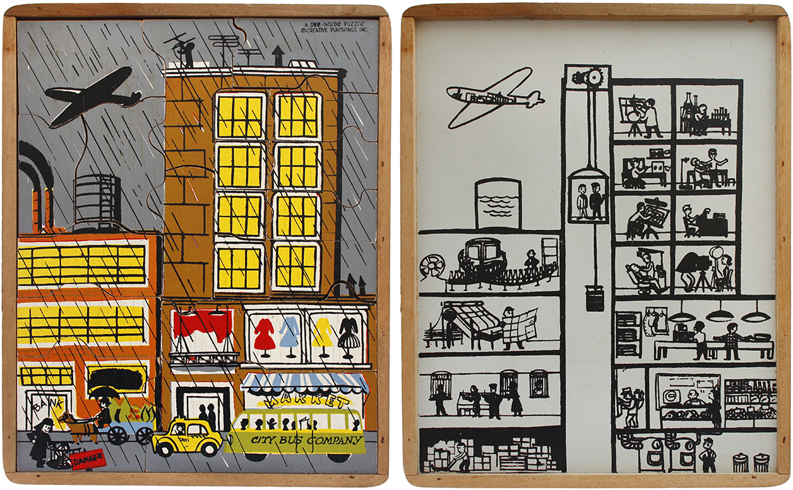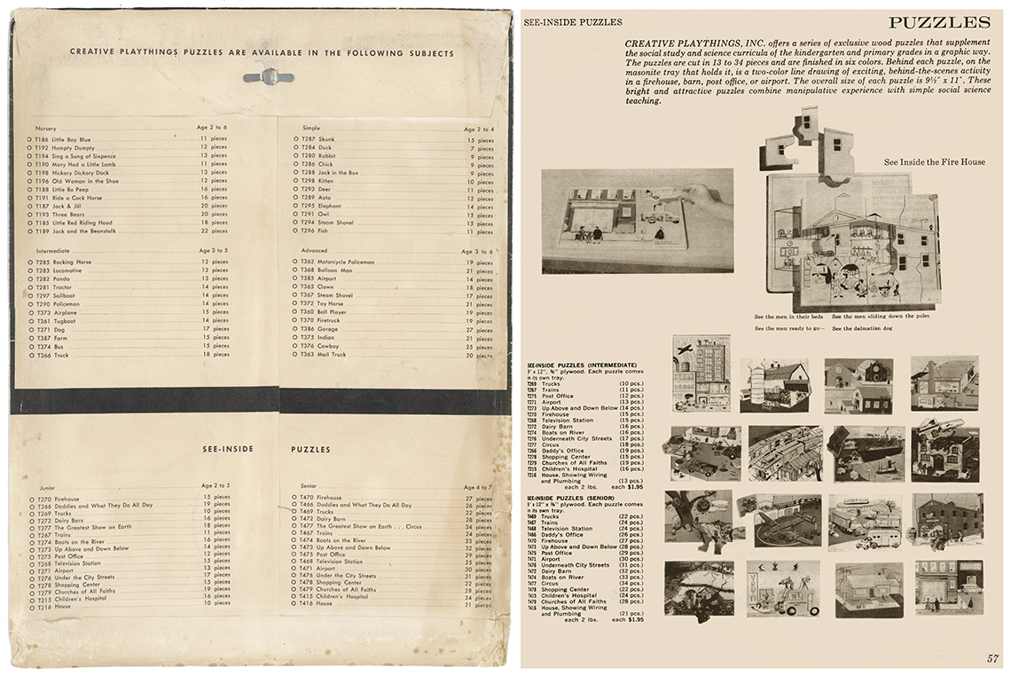 This series of puzzles by Creative Playthings Inc. dates from the 1950’s and are all see-inside puzzles – as the pieces are lifted they reveal an image beneath of what is inside, or beneath. The puzzles have all been photographed with the pieces removed showing the fabulous black and white drawings beneath the colour saturated painted layer. The majority of the puzzles in this set have the signature of Jeanne Bendick, who went on to illustrate over 100 books for children, in addition to writing scripts for television and films. Interestingly Jeanne Bendick married Robert Bendick in 1940, with Robert being one of the first of 3 cameramen at CBS-TV. The final puzzle in this section has often made me wonder what the message was being implied – featuring as it does, a TV cameraman filming a dancing man and woman with a muzzled bear between them outside a television studio – I think it may have been an in-joke between Jeanne and her TV cameraman husband Robert. The envelope pictured alongside was the packaging for the puzzles, and this arrived with my oversees purchase of the puzzle ‘Louie’s Diner’ in mint condition, having never previously seen the light of day. The envelope helpfully listed the entire catalogue of Creative Puzzles alongside the piece-count for the junior puzzles, ages 2 – 5 (10 – 19 pieces) and the same puzzles but with more pieces for the senior child, ages 4 to 7 (21 – 34 pieces) Creative Playthings, Inc. offers a series of exclusive wood puzzles that supplement the social study and science curricula of the Kindergarden and primary grades in a graphic way’