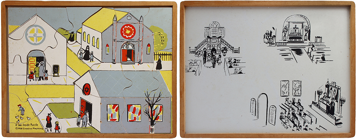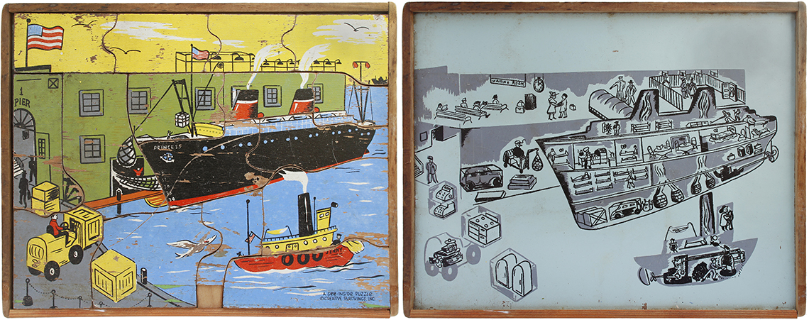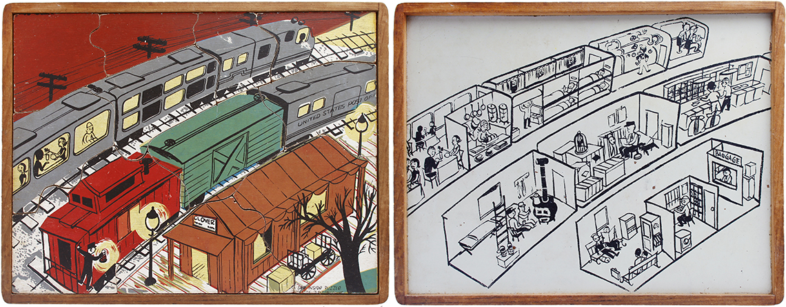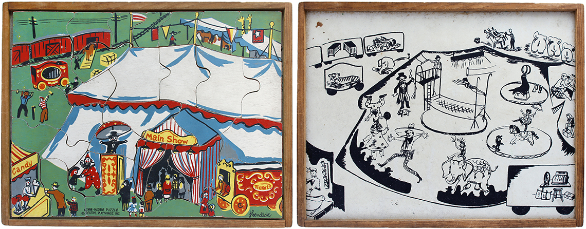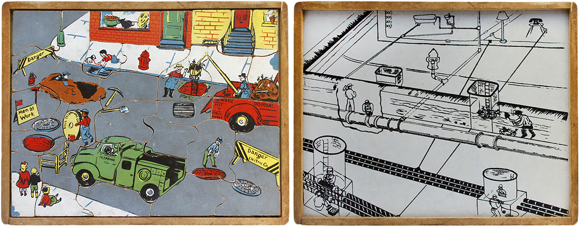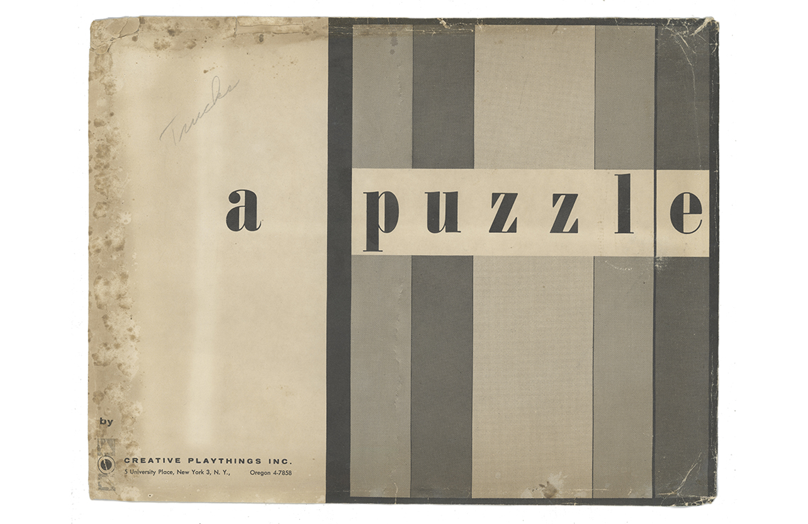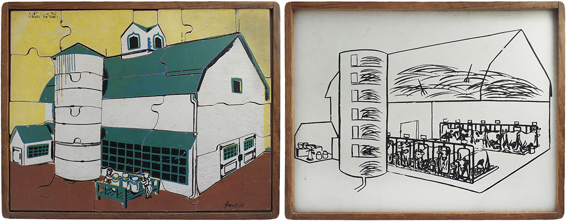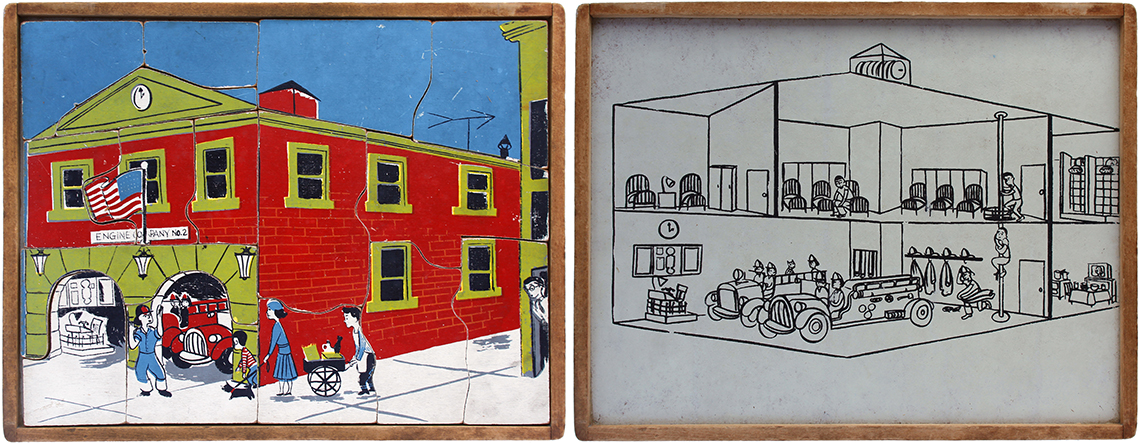 This series of puzzles by Creative Playthings Inc. dates from the 1950’s and are all see-inside puzzles – as the pieces are lifted they reveal an image beneath of what is inside, or beneath. The puzzles have all been photographed with the pieces removed showing the fabulous black and white drawings beneath the colour saturated painted layer. The majority of the puzzles in this set have the signature of Jeanne Bendick, who went on to illustrate over 100 books for children, in addition to writing scripts for television and films. Interestingly Jeanne Bendick married Robert Bendick in 1940, with Robert being one of the first of 3 cameramen at CBS-TV. The final puzzle in this section has often made me wonder what the message was being implied – featuring as it does, a TV cameraman filming a dancing man and woman with a muzzled bear between them outside a television studio – I think it may have been an in-joke between Jeanne and her TV cameraman husband Robert. The envelope pictured alongside was the packaging for the puzzles, and this arrived with my oversees purchase of the puzzle ‘Louie’s Diner’ in mint condition, having never previously seen the light of day. The envelope helpfully listed the entire catalogue of Creative Puzzles alongside the piece-count for the junior puzzles, ages 2 – 5 (10 – 19 pieces) and the same puzzles but with more pieces for the senior child, ages 4 to 7 (21 – 34 pieces) Creative Playthings, Inc. offers a series of exclusive wood puzzles that supplement the social study and science curricula of the Kindergarden and primary grades in a graphic way’