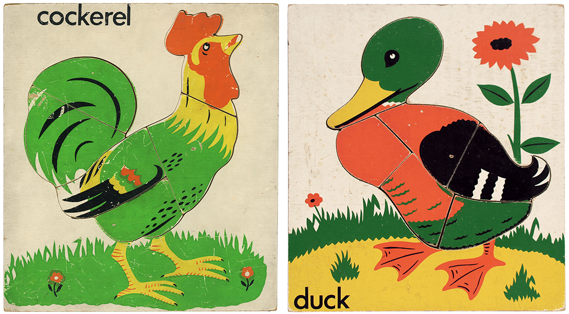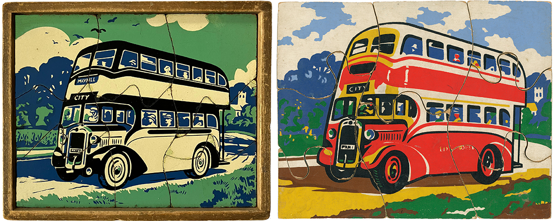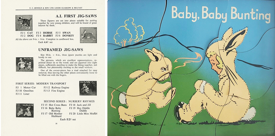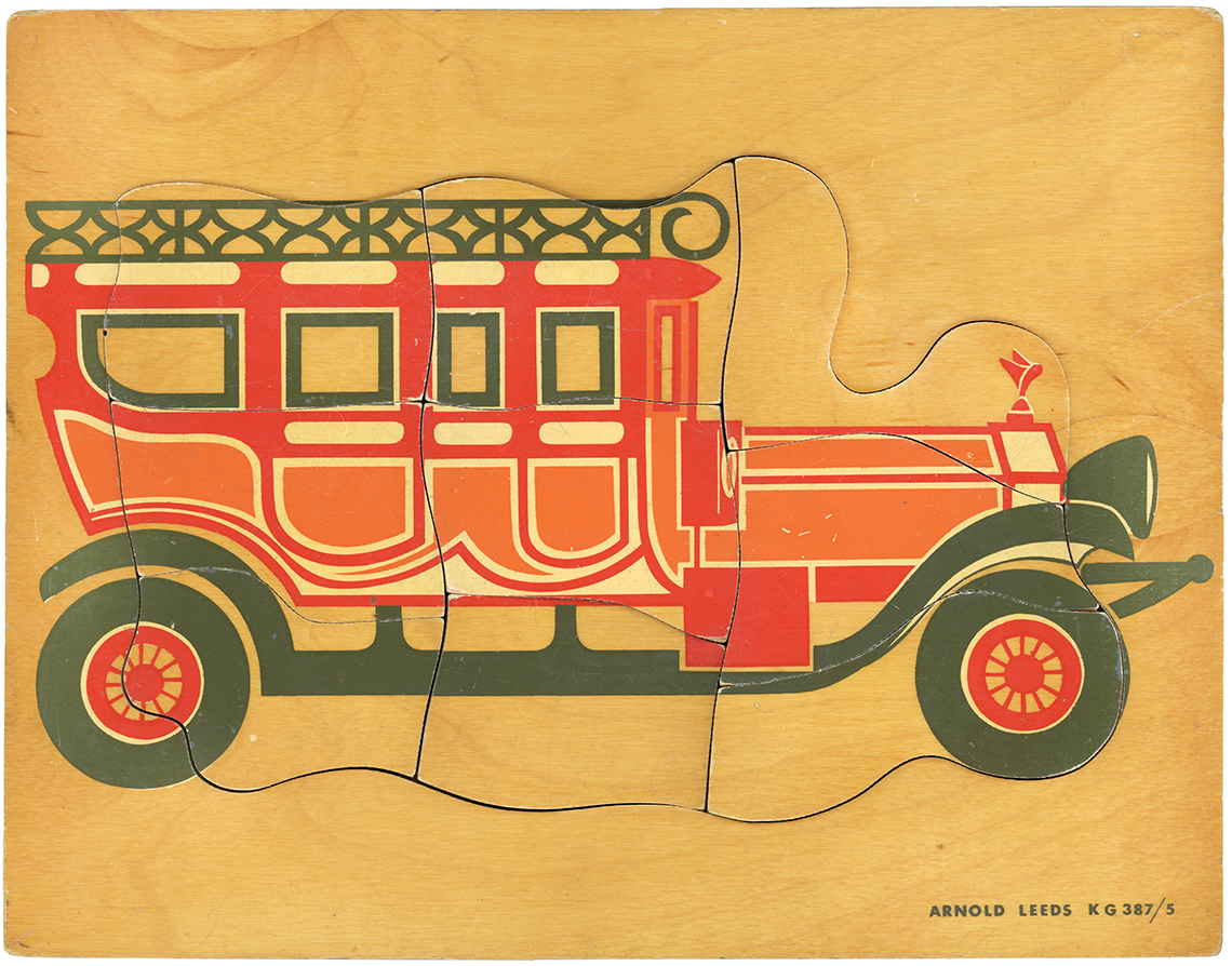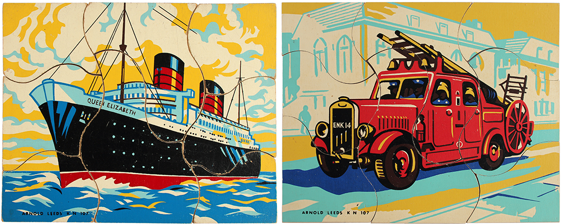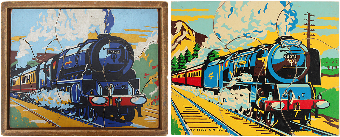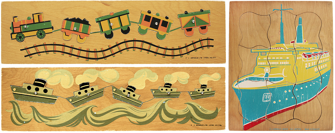 E.J.Arnold & Son is another UK Company with it’s roots firmly set in the history books having been founded in the 19th Century in Barnstaple before moving to Leeds in 1870. At its inception the company focussed on supplying books, games and apparatus to schools, later expanding to include globes, abacuses and jigsaw puzzles. There isn’t a great deal of information available about the products because the aim was to supply schools rather than the domestic marketplace and so, catalogues which are available tend to be extensive ranges of everything needed to equip a school and form long lists rather than colourful images to lure parents to purchase. We have sourced an undated E.J.Arnold educational catalogue however, and this lists some of the puzzles included in this section. From the language used, which lists ‘Omnibus’ within the ‘Modern Transport’ puzzle section, we can deduce that buses were a relatively new concept taking over from the horse and cart, so likely dating the catalogue to the period between WW1 and WW2. Some of the transport puzzles that were probably manufactured during this era can be seen below, which shows 3 puzzles absent of any branding. The Steam Train with the nameplate Bon Accord (this loco was brought into production in 1949) is a later version and bares the E.J.Arnold branding. It is also possible to see the move from jigsaws being made upon wooden trays to the later more modern design of jigsaws being made within their own self contained tray.
