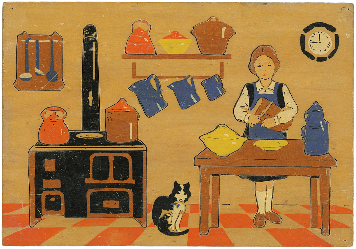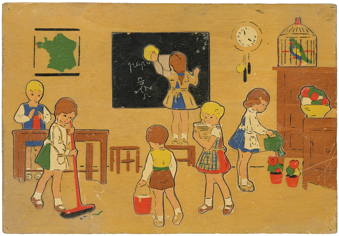 3 French Puzzles - School, Kitchen and Dinner 12" X 9" Unknown Designer or Maker