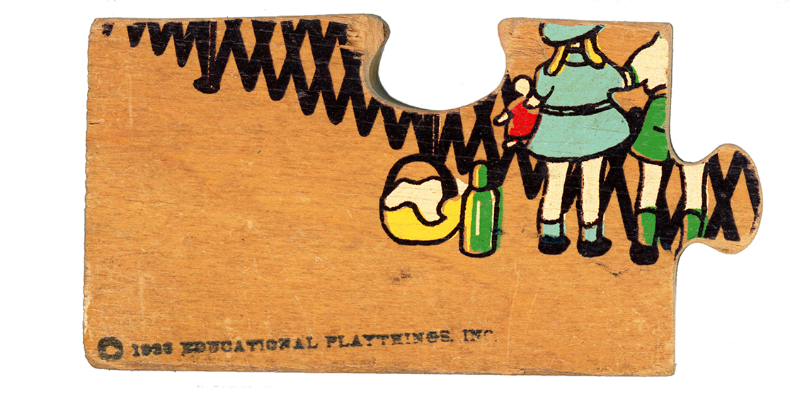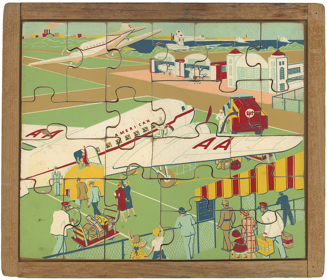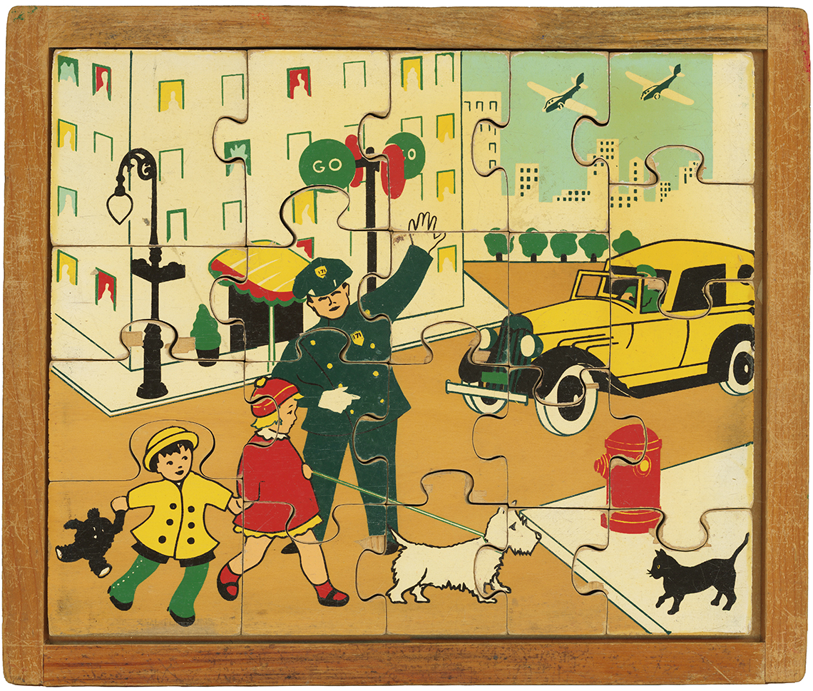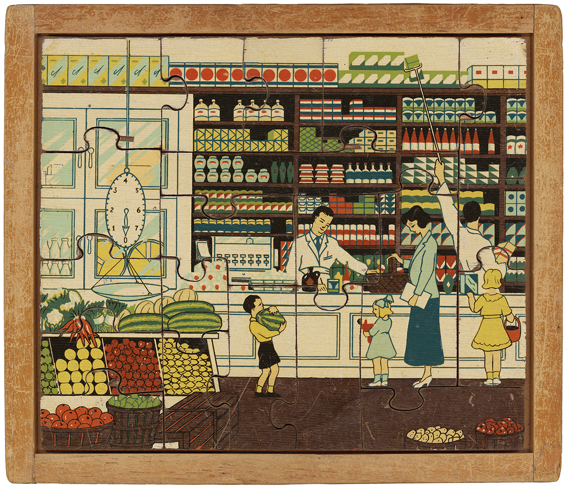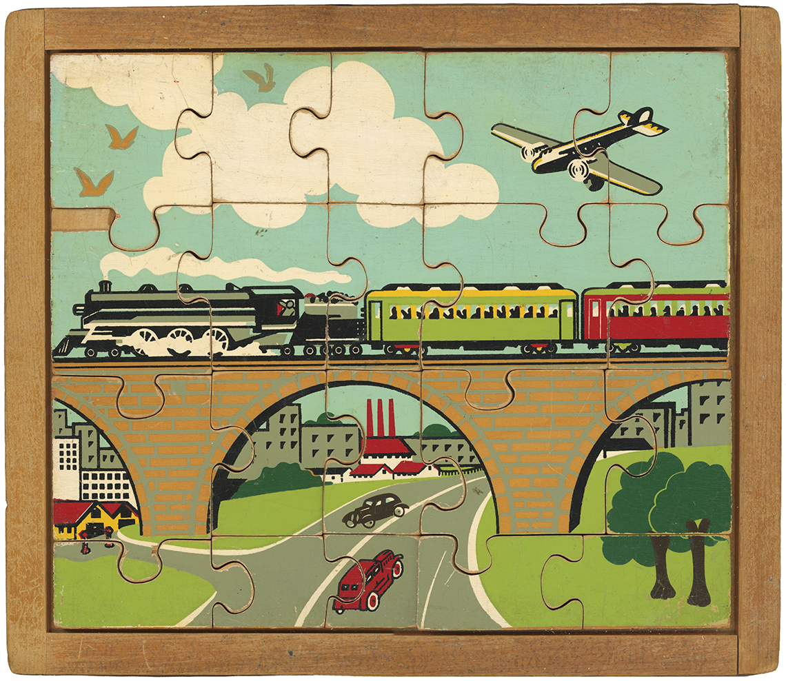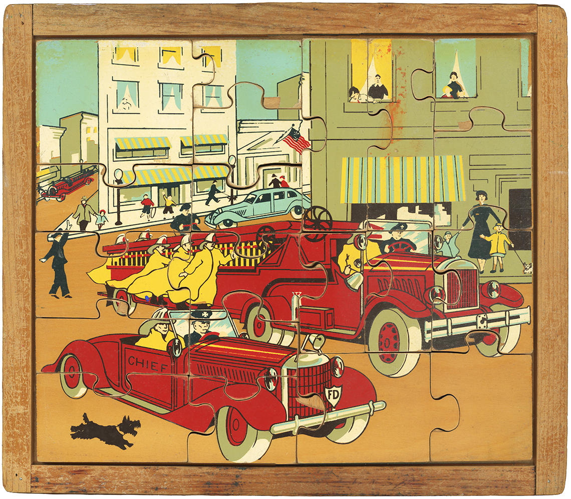 If it is difficult to find out about the companies in the UK who made wooden puzzles 50 years ago or more, it is even harder to research American jigsaw puzzle companies from almost 100 years ago. The puzzles shown here were manufactured by Educational Playthings Inc. (with the exception of the New York syline puzzle, which is unattributed). Educational Playthings Inc were active in New York during the period of the 1930’s to 40’s, and whilst the era predated the use of company logos on the front of their products, ink-stamped in almost illegible print are the words Educational Playthings Inc and a date to the back of single puzzle pieces, hence we have been reliably able to identify and date this sequence. The puzzles themselves depict a time of development and frequently feature transport – which in this era would have been at the cutting edge of what was available, opening up possibilities for travel and exploration. It should be noted however that whilst the puzzles depict times of what would look to be economic growth and adventure, it was the period of The Great Depression which lasted from 1929 until 1941. We can see from some very faint markings on some of the puzzles pieces that the puzzles appear to have been made in 1933 (Ferry), 1932 (Fire Engines) and 1949 (Grocery Store).